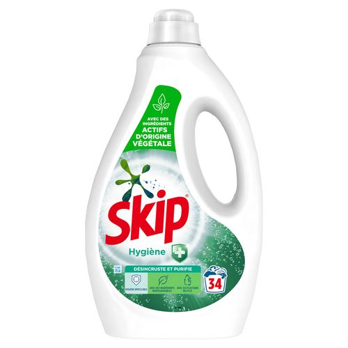 Lessive Liquide Skip Hygiène 34 Lavages. Cette lessive élimine les odeurs tenaces, purifie et protège vos vêtements. Elle contient des ingrédients actifs d'origine végétale et est efficace même en cycle court. Une formule efficace dès 30 °C pour une propreté impeccable en consommant moins d'énergie. Dose lessive recommandée : 50 ml pour une eau peu ou moyennement dure. Ajouter 15 ml de lessive pour une eau dure ou du linge très sale. Pour un lavage à la main, diluer 35 ml dans 10 litres d’eau. Ne pas utiliser sur la laine et la soie. Skip favorise des emballages 100 % recyclables pour la réduction des déchets plastiques. Les lessives liquides offrent toute l'efficacité de Skip pour des résultats impeccables sur différents types de taches (chocolat, huile de cuisine, confiture de fraise, boue) et pour des couleurs et un blanc éclatants. Être actif et vivre de manière intense signifie souvent se salir. Mais cela fait partie du jeu et de l’apprentissage de la vie. C’est pour cela que Skip s’engage à prendre soin de votre linge tout en vous garantissant une propreté impeccable. Avec Skip, on est libre de se salir ! Voilà notre philosophie. Chez Skip, nous sommes convaincus que les enfants ont besoin d’expérimenter, de jouer dehors et de découvrir le monde qui les entoure en toute sérénité, afin de se préparer à demain ! Cela contribue pleinement à leur développement physique et émotionnel. En tant que marque innovante et dynamique, Skip a pour ambition d'initier un nouveau dialogue avec les mamans, en les invitant à ne plus se soucier des taches et à laisser leurs enfants libres de se salir. C’est pourquoi Skip innove constamment pour vous proposer des produits toujours plus efficaces contre les tous les types taches, même les plus tenaces. Skip, il est temps de changer. Lessive Liquide