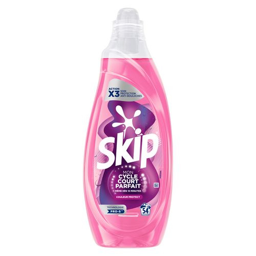 Découvrez SKIP Mon Cycle Court Parfait, la première lessive spécialement conçue pour les cycles courts. Cette lessive a été élue produit de l'année 2025*. Elle délivre une efficacité optimale, même dès 15 minutes et un gain de temps, sans compromis sur la propreté de votre linge. Grâce à ses 3 actions, la lessive liquide SKIP Cycle Court Couleur Protect 54 Lavages garantit un soin optimal et une protection renforcée, et élimine les bouloches. Utilisez également Couleur Protect pour raviver l'éclat de vos vêtements. Sa formule innovante dotée de la technologie Pro-S™ permet une dissolution très rapide et libère ainsi ses actifs dès les 15 premières minutes du cycle de votre machine à laver. SKIP Mon Cycle Court Parfait Couleur Protect convient aux vêtements en laine et en soie. Économisez de l'électricité et de l'eau en utilisant Skip Mon Cycle Court Parfait lors du programme cycle court de votre machine à laver. Pour un résultat optimal en cycle court, même dès 15 minutes, le dosage recommandé est de 40 ml pour moins de 2 kg de linge (eau douce ou moyennement dure). Ajouter 10 ml si l'eau est dure. Pour un cycle standard, le dosage recommandé est de 40 ml pour 4-5 kg de linge (eau douce ou moyennement dure). Ajouter 10 ml si l'eau est dure. *Étude indépendante treetz/Cint fin 2024 – poyfrance.com.