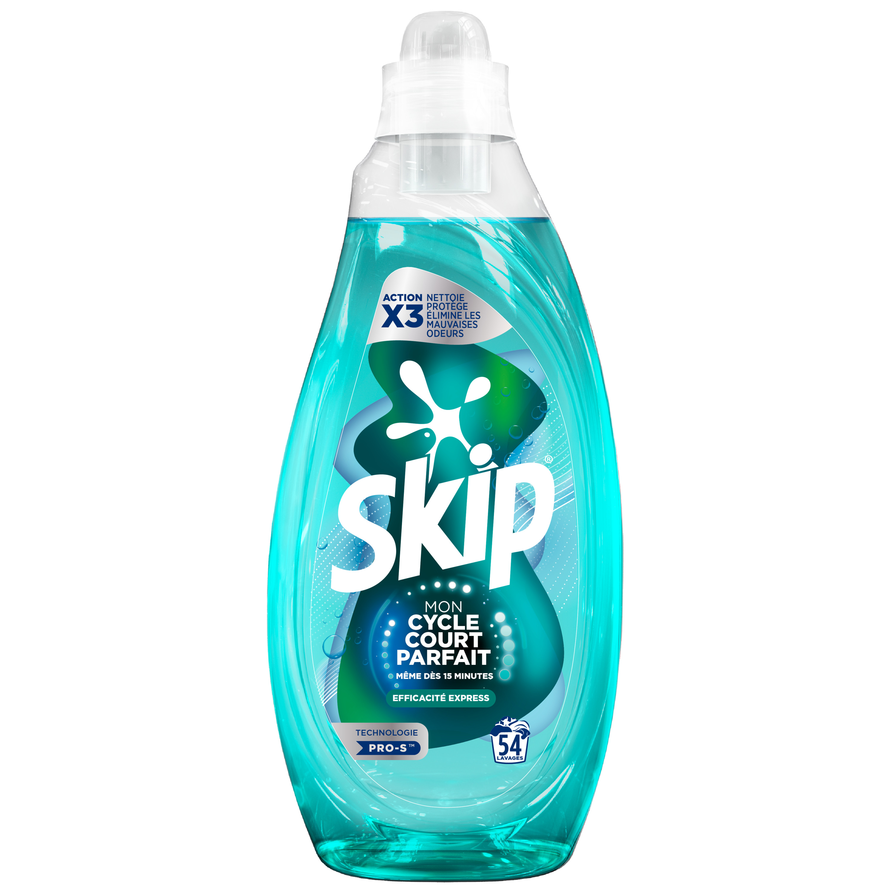 La lessive liquide SKIP Cycle Court Efficacité Express 54 Lavages est la première lessive spécialement conçue pour les cycles courts. Efficacité optimale, même dès 15 minutes.