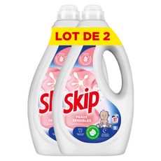 La lessive liquide Skip Peaux Sensibles & Bébé 2x37 lavages est la lessive idéale pour les peaux sensibles. Elle vous garantit une propreté impeccable et un linge éclatant tout en étant douce pour les peaux sensibles. Testée dermatologiquement, la lessive Skip respecte les peaux les plus délicates de toute la famille, notamment celle des bébés et des jeunes enfants. Toute l'efficacité de Skip dans une formule respectueuse de l'environnement et de la peau. Avec des ingrédients actifs d'origine végétale, elle garantit un résultat 100 % impeccable pour un linge propre, éclatant et frais pour longtemps. La lessive liquide Skip est efficace en cycle court et dès 30 °C. Avec la lessive liquide Skip, économisez de l'énergie à chaque lavage et réduisez les émissions de CO₂. Cette lessive liquide convient aux machines à laver à dosage automatique (auto-dose). Versez une dose dans le bac à produit de votre machine. 45 ml : dosage recommandé pour une eau peu ou moyennement dure. Ajouter 15 ml de lessive pour une eau dure ou du linge très sale. Lavage à la main : diluer 35 ml dans 10 L d'eau. Prétraitement des taches : 1. Déposez une petite quantité de la lessive liquide Skip sur les taches 2. Frottez doucement 3. Lancez le cycle de lavage immédiatement. Skip, ce sont plus de 60 ans d'expertise et d'innovations dans le domaine des lessives, toujours guidées par une volonté d'améliorer le quotidien des familles. Skip, c'est aussi une philosophie de marque unique ! Chez Skip, nous sommes convaincus que nos enfants ont besoin d'expérimenter, de jouer dehors et de découvrir le monde qui les entoure en toute sérénité, afin de se préparer à demain. Ainsi, chaque tache peut être synonyme d'un moment de joie et de partage, d'un challenge réussi ou d'une nouvelle aventure. Pour nous, la saleté des vêtements est la marque de l'action. C'est pourquoi nos lessives sont efficaces sur les taches, même les plus tenaces. Avec Skip, la saleté, c'est bien et ça le sera toujours. Skip s'engage à prendre soin de votre linge à l'épreuve de la vie et du quotidien !