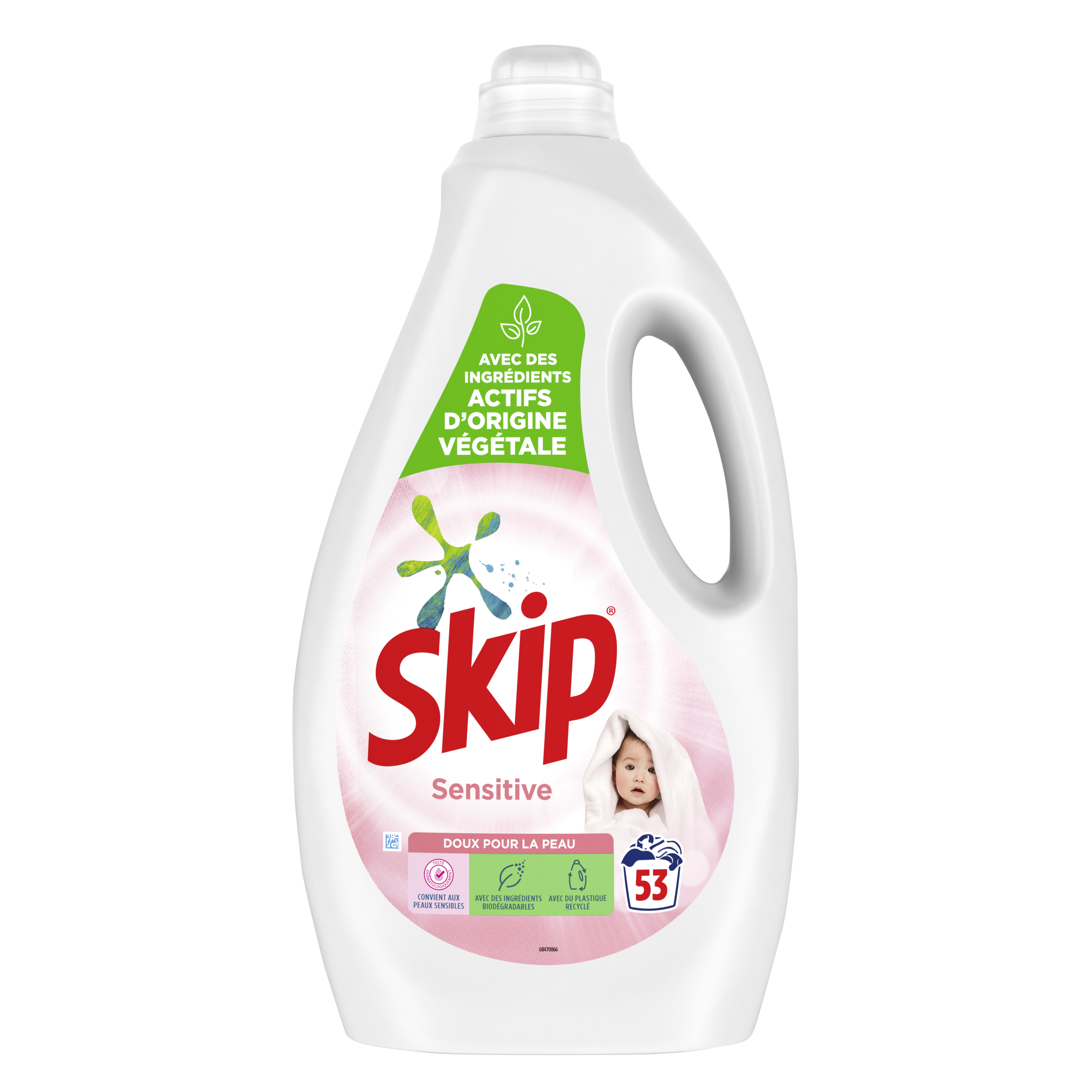 Lessive liquide Skip Sensitive 53 Lavages. Cette lessive testée dermatologiquement est spécialement adaptée aux peaux sensibles. Sa formule contient des ingrédients actifs d'origine végétale et biodégradables. Cette lessive pour le linge est efficace même en cycle court et dès 30 °C, pour une propreté impeccable en consommant moins d'énergie. Dose lessive recommandée : 50 ml pour une eau peu ou moyennement dure. Ajouter 15 ml de lessive pour une eau dure ou du linge très sale. Pour un lavage à la main, diluer 35 ml dans 10 l d’eau. Ne pas utiliser pour la laine et la soie. Skip favorise des emballages 100 % recyclables pour la réduction des déchets plastiques. L’efficacité de Skip tout en respectant les peaux sensibles, une formule efficace testée dermatologiquement. Être actif et vivre de manière intense signifie souvent se salir. Mais cela fait partie du jeu et de l’apprentissage de la vie. C’est pour cela que Skip s’engage à prendre soin de votre linge tout en vous garantissant une propreté impeccable. Avec Skip, on est libre de se salir ! Voilà notre philosophie. Chez Skip, nous sommes convaincus que les enfants ont besoin d’expérimenter, de jouer dehors et de découvrir le monde qui les entoure en toute sérénité, afin de se préparer à demain ! Cela contribue pleinement à leur développement physique et émotionnel. En tant que marque innovante et dynamique, Skip a pour ambition d'initier un nouveau dialogue avec les mamans, en les invitant à ne plus se soucier des taches et à laisser leurs enfants libres de se salir. C’est pourquoi Skip innove constamment pour vous proposer des produits toujours plus efficaces contre les tous les types taches, même les plus tenaces. Skip, il est temps de changer. Lessive liquide