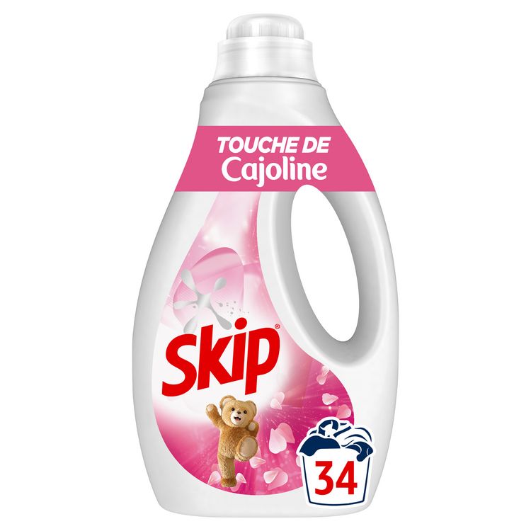 La lessive liquide Skip Touche de Cajoline 34 Lavages offre une fraîcheur intense à vos vêtements et votre linge de maison. La lessive Skip Touche de Cajoline saura vous transporter grâce à son parfum* frais inspiré des fragrances délicates des adoucissants Cajoline. Toute l'efficacité de Skip dans une formule plus respectueuse de l'environnement grâce à ses ingrédients actifs d'origine végétale. Cette lessive liquide garantit un résultat impeccable pour un linge propre, doux et frais pour longtemps. La lessive Skip Touche de Cajoline est également efficace en un seul lavage contre les taches, même en cycle court et dès 30 °C. Avec la lessive liquide Skip, économisez de l'énergie à chaque lavage et réduisez les émissions de CO₂. De plus, sa bouteille et son bouchon sont entièrement recyclables. Cette lessive liquide convient aux machines à laver à dosage automatique (auto-dose). Versez une dose dans le bac à produit de votre machine. 45 ml : dosage recommandé pour une eau peu ou moyennement dure. Ajouter 15 ml de lessive pour une eau dure ou du linge très sale. Lavage à la main : diluer 35 ml dans 10 L d'eau. Prétraitement des taches : 1. Déposez une petite quantité de la lessive liquide Skip sur les taches 2. Frottez doucement 3. Lancez le cycle de lavage immédiatement. Skip, ce sont plus de 60 ans d'expertise et d'innovations dans le domaine des lessives, toujours guidées par une volonté d'améliorer le quotidien des familles. Skip, c'est aussi une philosophie de marque unique ! Chez Skip, nous sommes convaincus que nos enfants ont besoin d'expérimenter, de jouer dehors et de découvrir le monde qui les entoure en toute sérénité, afin de se préparer à demain. Ainsi, chaque tache peut être synonyme d'un moment de joie et de partage, d'un challenge réussi ou d'une nouvelle aventure. Pour nous, la saleté des vêtements est la marque de l'action. C'est pourquoi nos lessives sont efficaces sur les taches, même les plus tenaces. Avec Skip, la saleté, c'est bien et ça le sera toujours. Skip s'engage à prendre soin de votre linge à l'épreuve de la vie et du quotidien ! *Parfum de synthèse.