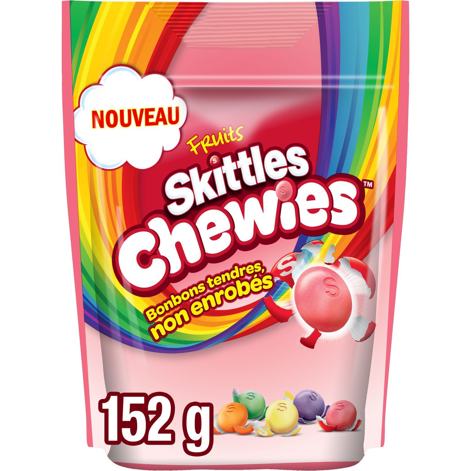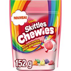 Skittles "Chewies" Fruits pochon de 152g Skittles®, des bonbons tendres dragéifiés aux fruits aux couleurs de l'arc-en ciel! Une variété de parfums : fraise, citron, pomme, raisin ou framboise.