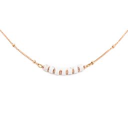 En savoir +Ce collier Piana est composé de pierres d'Howlite et s'ajuste de 41 à 45 cm grâce à sa chaînette d'extension. Il se distingue par la forme cylindrique de ses pierres qui sublimeront votre visage. Le fermoir et les inserts en acier inoxydable de couleur dorée rose s'harmonisent parfaitement avec les nuances de la pierre d'Howlite. Chic et discret, le collier Piana s'associera avec la plupart de vos tenues. La pierre de Howlite est appréciée pour ses propriétés qui facilitent le sommeil. Tous les bijoux SLOYA sont livrés dans un écrin à l'effigie de la marque.
