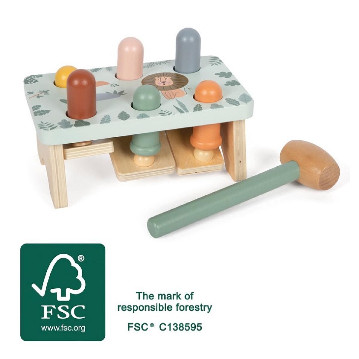 Un banc à marteler pour les petits explorateurs du monde animalier ! Ce banc à marteler conçu avec amour au détail, en bois certifié FSC® 100% et au look safari, invite les enfants à frapper avec le marteau les bâtons en bois qui dépassent du banc de frappe, avec un effet surprenant : lorsqu'une tig