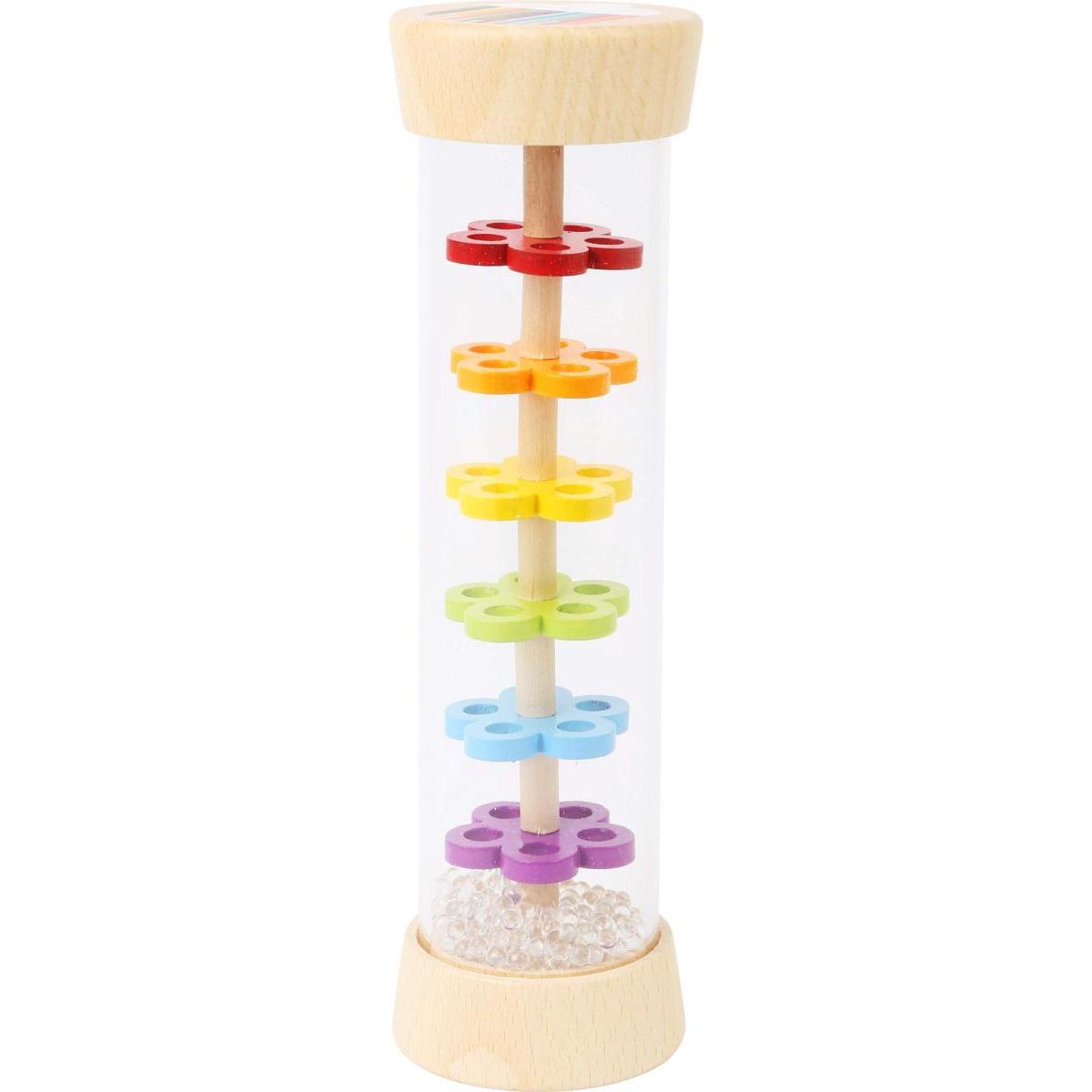 le bâton transparent permet de voir les boules de verre qui coulent à travers les six plaques perforées sous forme de fleurs.