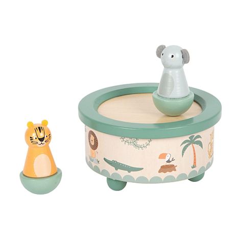 Cette boîte à musique en bois certifié FSC se compose de deux adorables animaux sauvages, un tigre et un éléphant, qui s'animent et tournent au premier son de la mélodie. Les deux figurines en bois sont amovibles et la boîte à musique est très facile à utiliser ce qui permet aux enfants de s'en serv