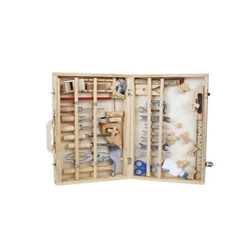 C'est le meilleur de nos coffres à outils : coffret en bois à charnières avec de nombreuses pièces pour les petits artisans ! Pour chaque réparation essentielle, vous trouverez les bons outils, par exemple une règle et un crayon de menuisier, une clé, une clé à douille, un marteau et une scie ! Tous