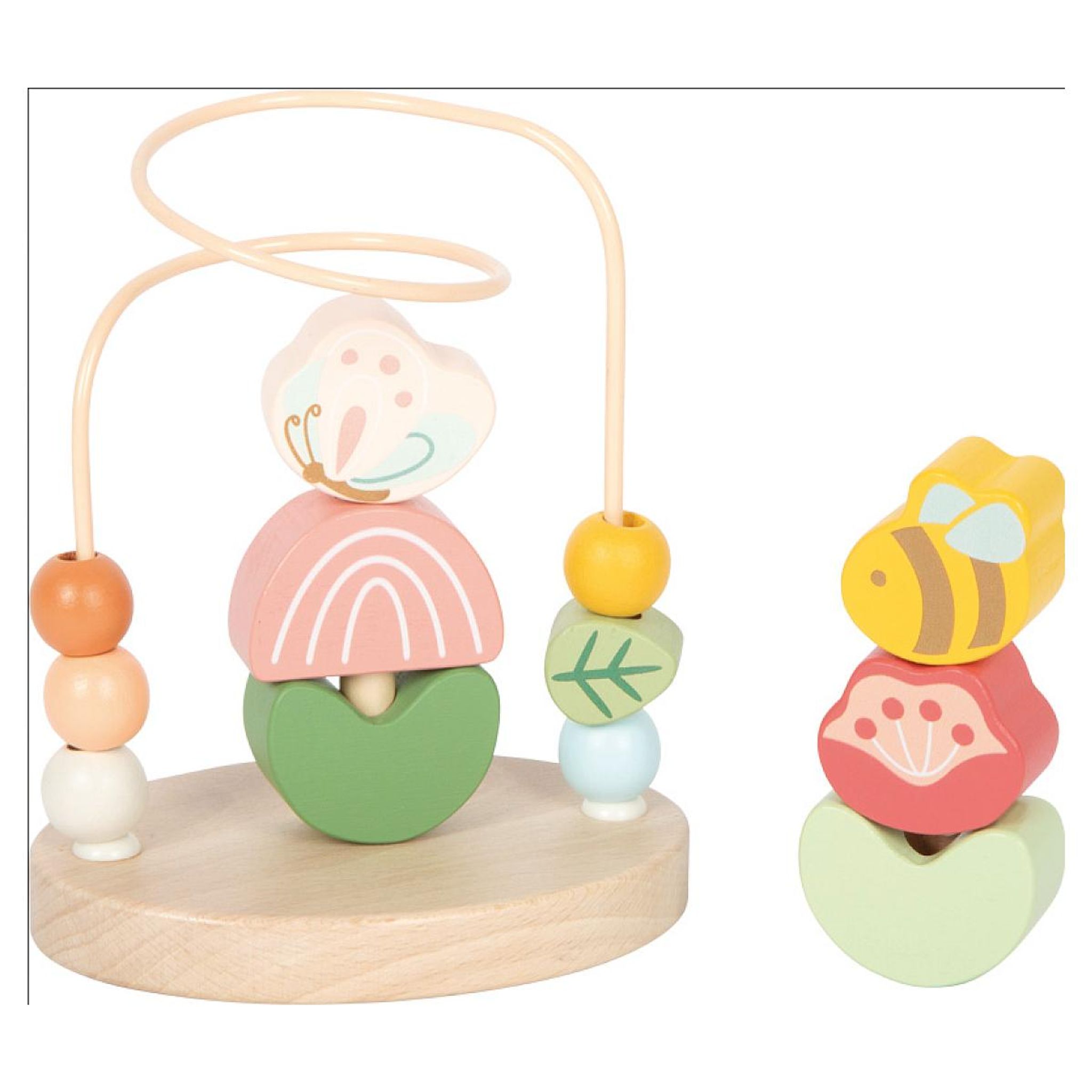 circuit de motricité compacte avec des motifs adaptés aux enfants circuit métallique solide avec 6 éléments en bois colorés à pousser jeu d'empilage intégré avec 6 éléments en bois (abeille, papillon, 2 fleurs, 2 feuilles) design adorable avec beaucoup de bois naturel parfait pour les premiers exercices de motricité dès la petite enfance compact, léger et idéal pour les voyages fabriqué en bois et métal de haute qualité, adapté aux enfants favorise les mouvements de préhension, la motricité fine et la coordination ?il-main