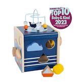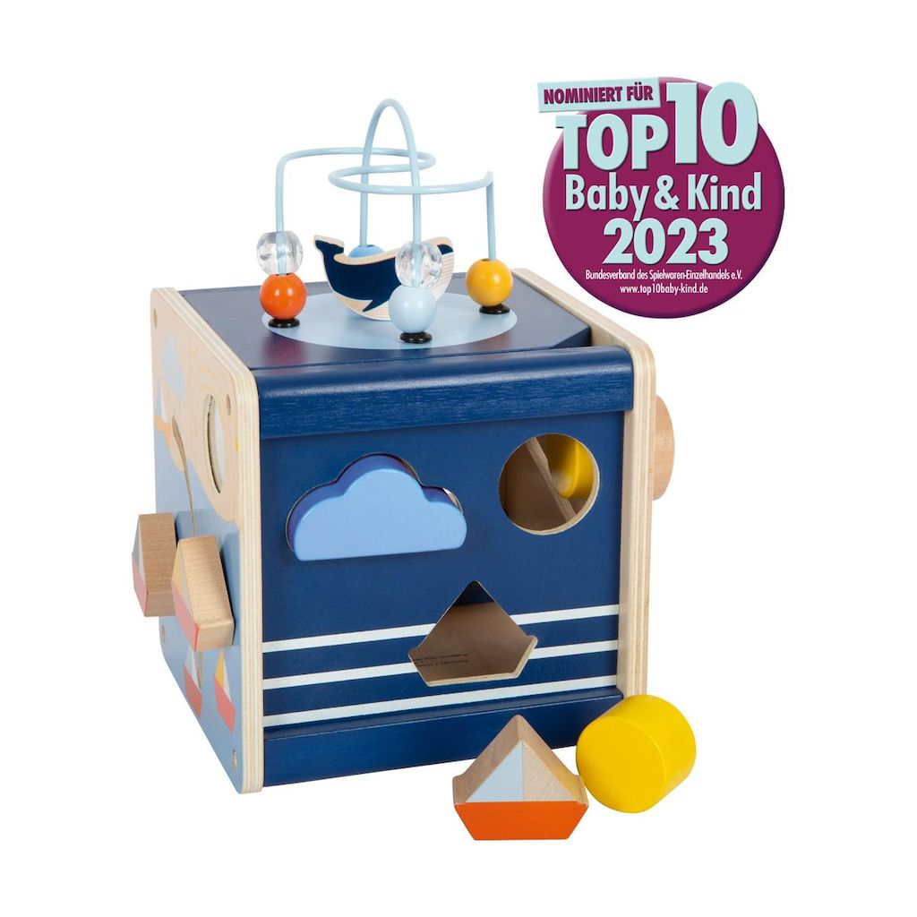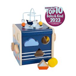 Le cube se compose de cinq surfaces à jouer avec deux boucles de motricité, un jeu d'encastrement de formes, un labyrinthe coulissant et un jeu de volets tournants. Le cube de motricité permet d'exercer l'habileté et la motricité fine de manière ludique et de stimuler la coordination ?il-main. En ou