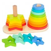 Dans ce jeu à encastrer, vous devez empiler les mêmes formes dans la même taille pour que les couleurs de l'arc-en-ciel soient placées dans le bon ordre. En empilant, en encastrant et en triant, les enfants apprennent de manière ludique à connaître différentes formes, couleurs et tailles et à dévelo
