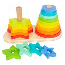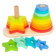 Dans ce jeu à encastrer, vous devez empiler les mêmes formes dans la même taille pour que les couleurs de l'arc-en-ciel soient placées dans le bon ordre. En empilant, en encastrant et en triant, les enfants apprennent de manière ludique à connaître différentes formes, couleurs et tailles et à développer leur motricité fine et leur coordination ?il-main