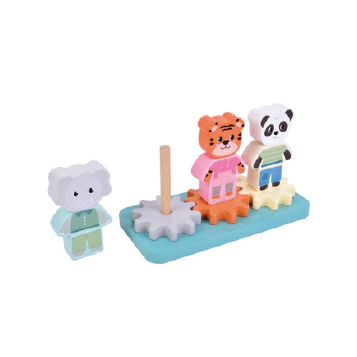 S'amuser en tournant et en construisant ! Ce jouet à empiler en bois certifié FSC® 100% est un jeu plein de couleur qui favorise la motricité et développe la dextérité et la pensée logique. Trois adorables animaux de la jungle, un éléphant, un tigre et un panda, chacun composés de trois éléments en bois, sont empilables et doivent être placés dans le bon ordre sur une roue dentée. Dès qu'on fait tourner une roue dentée, les deux autres animaux se mettent également en mouvement - un effet fascinant qui permet de découvrir la relation entre la cause et l'effet. Un jouet d'empilage créatif et éducatif ! Les formes adaptées aux enfants, les couleurs gaies et les bords arrondis garantissent une expérience de jeu sûre, tandis que les enfants apprennent de manière ludique à alter, empiler et tourner. Un jouet éducatif idéal pour les petits explorateurs !