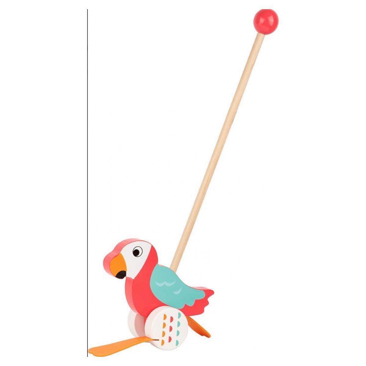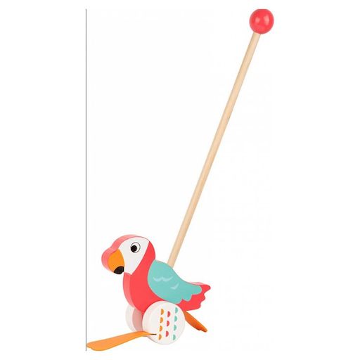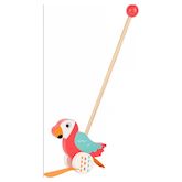 Tous les enfants adorent se balader avec ce perroquet coloré. Lorsqu'on le pousse, ce compagnon amusant dandine des pieds à chaque tour de roues. Grâce à la boule en bois sur le manche il est très facile à promener.