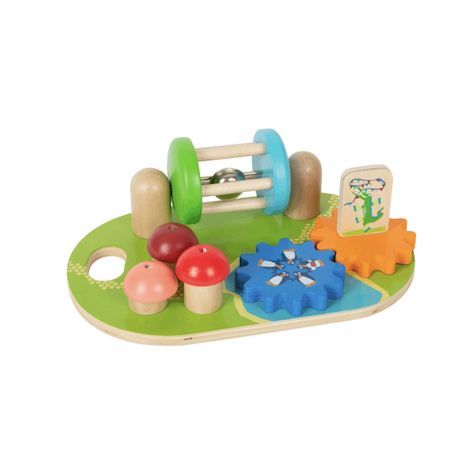 Le plaisir du jeu et de la motricité pour les tout-petits ! Cette planche de motricité en bois, colorée et adaptée aux enfants, offre aux jeunes enfants une multitude de possibilités de jeux et d'activités pour développer leur motricité fine. Tandis que les deux roues dentées peuvent être tournées et les éléments fixés par des élastiques rabattus, le hochet rotatif avec clochette assure des stimulations acoustiques. En pliant, tournant et tirant, la planche d'activités entraîne la préhension ainsi que la coordination ?il-main. Un jouet en bois qui stimule la motricité de manière optimale. Peut être posé ou tenu par la poignée évidée pour jouer.