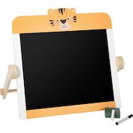 Le plateau de table en bois 2 en 1 combine un tableau noir, un tableau blanc et une surface magnétique, offrant un divertissement créatif Tableau de haute qualité avec craie blanche, marqueur pour tableau blanc et éponge facile à tenir avec une poignée en bois pour peindre et écrire Le tableau avec son motif tigre soigneusement conçu encourage la créativité et le jeu de rôle sur les thèmes de la crèche, de l'école et des leçons Grâce au cadre de support mobile, la planche d'apprentissage est très facile à installer sur la table et peut être rangée pour économiser de l'espace après le jeu Env. 40 x 5 x 45 cm