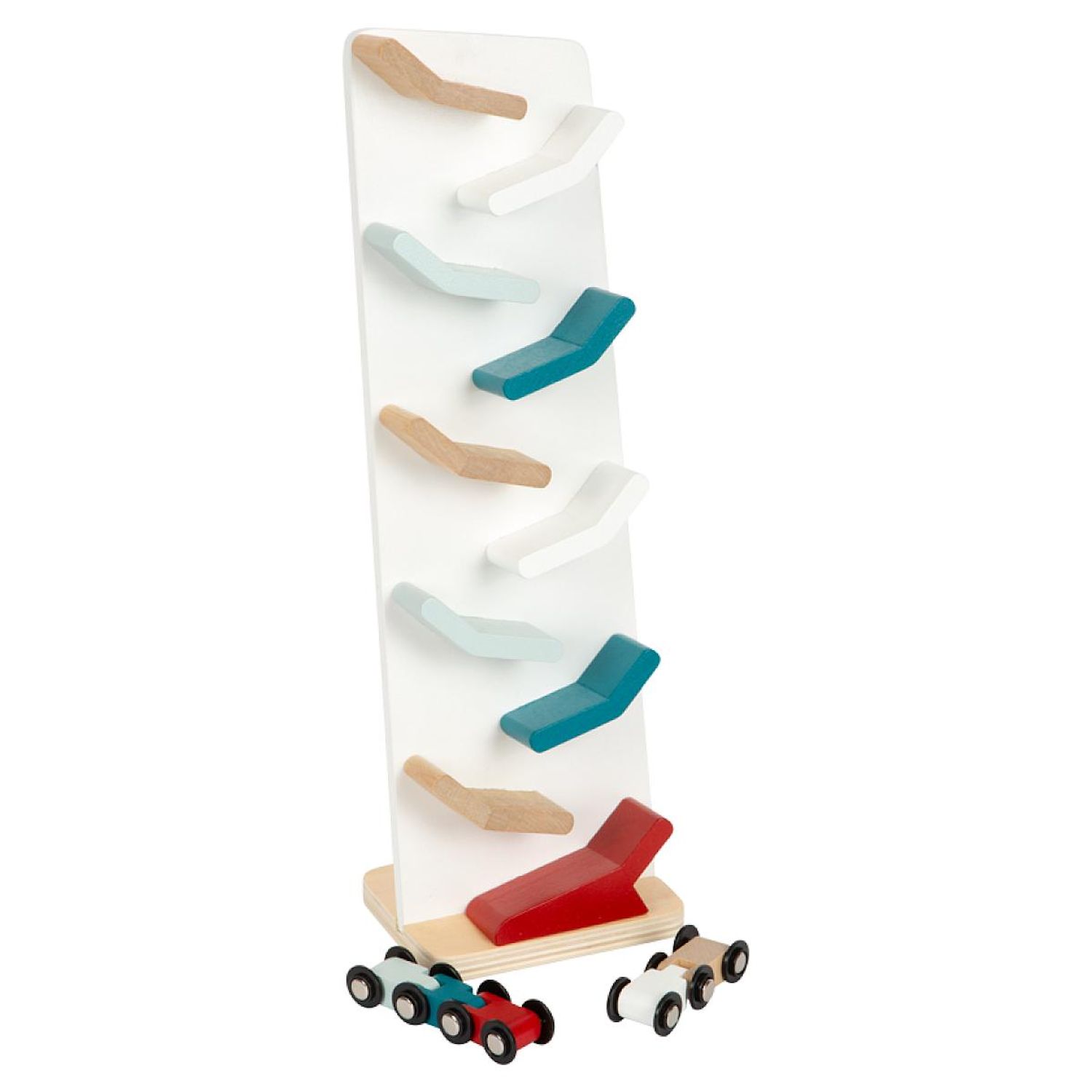 Un plaisir de jeu sans limite ! Cette tour en cascade en bois attire tous les regards lorsque les véhicules articulés multicolores dévalent les marches du circuit à toute allure et avec un joyeux cliquetis, avant de poursuivre leur course sur le sol un petit peu plus loin, à pleine vitesse. Véhicules articulés inclus, un à 3 éléments et un à 2 éléments. Un jouet en bois à la fois apaisant et fascinant ! Une fois lâchée en haut, la voiture articulée et mobile dévale d'elle-même la piste en zigzaguant rapidement et en faisant de rapides culbutes. Chaque descente devient ainsi une expérience et la tour en cascade une occupation prolongée dans la chambre d'enfant. Les couleurs modernes combinées au bois naturel et blanc en font également un article de décoration très tendance !