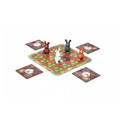 Découvrez le jeu Surprises dans le potager de Smartgames, un jeu de plateau familial pour jouer de 2 à 4 joueurs à partir de 4 ans. C'est l'heure du repas dans le potager, qui remplira son garde-manger de 4 légumes différents en premier ?. Placez les 16 pastilles légumes aléatoirement et face cachée sur le plan de jeu, puis recouvrez-les de feuilles, sauf une, pour pouvoir coulisser les tuiles. Chaque joueur prend un lapin et son garde-manger, puis place son lapin sur une tuile à l'intersection de la feuille manquante, afin de la faire coulisser et révéler le légume caché en dessous. S'il ne possède pas encore ce légume, il le pose dans son garde-manger. S'il le possède déjà, il le laisse sur place, permettant aux autres joueurs de peut-être le récupérer plus tard pour eux-mêmes..