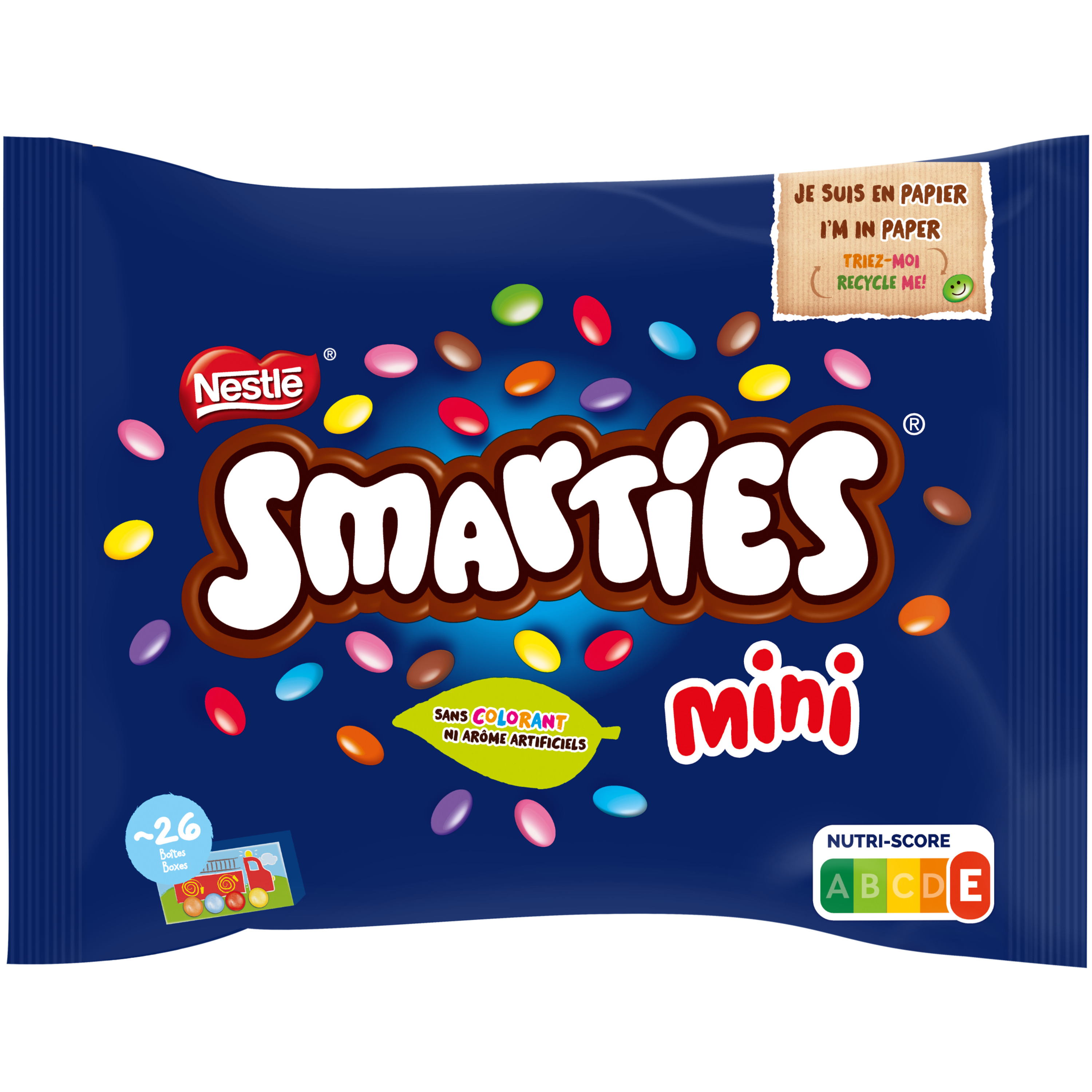 SMARTIES® vous accompagne depuis 1937 avec de délicieuses billes au chocolat. Retrouvez ces bonbons multicolores au bon goût de chocolat pour faire plaisir à vos enfants comme à toute la famille ! Composés de chocolat au pur beurre de cacao, ces petites billes craquantes contiennent jusqu'à 65% de chocolat au lait et se présentent sous huit couleurs différentes. Les couleurs de SMARTIES® sont d'origine naturelle et proviennent d'un mélange de concentrés de fruits et de plantes. Existe en plusieurs formats.