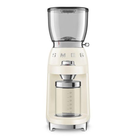 Smeg CGF01CREU Le moulin à café Années 50 Smeg CGF01CREU est un broyeur conique en acier inox, amovible pour un nettoyage aisé. Réservoir à grain avec système de verrouillage rotatif. Le CGF01CREU est doté de 30 possibilités de broyage réparties en 3 segments : FIN ? pour Moka et Expresso, MOYEN ? p