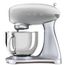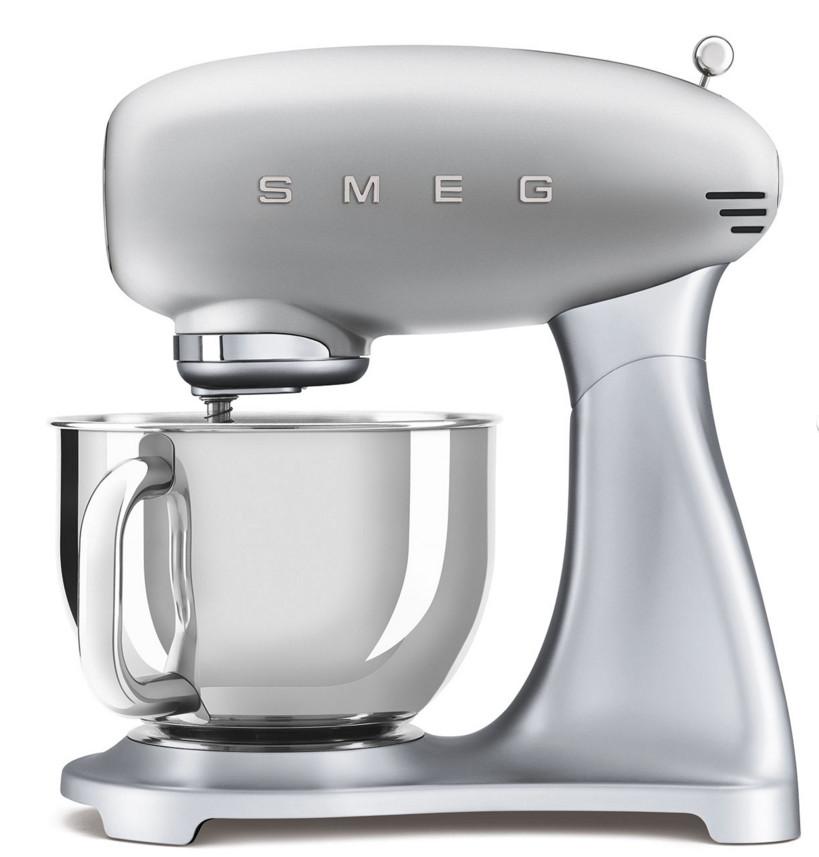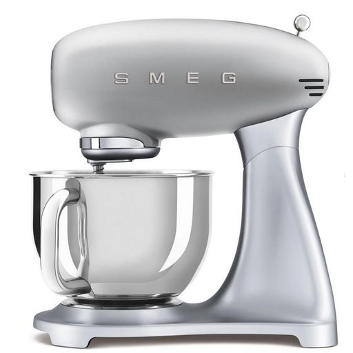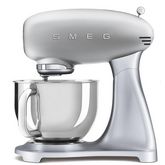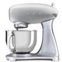 Robot pâtissier SMEG SMF02SVEU 800W design des années 50. Couleur Gris métal. 10 vitesses. Accessoires inclus : Fouet à fils. Batteur plat lavable au lave-vaisselle. Batteur plat. Crochet pétrisseur lavable au lave-vaisselle. Bol 4.8L. Couvercle verse