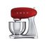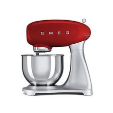 Smeg SMF02RDEU Robot sur socle Années 50 Smeg SMF02RDEU en aluminium coulé vernis avec base en alliage de zinc vernis et levier de contrôle en acier inoxydable. La gamme Années 50 se caractérise par un incomparable look rétro et vintage avec une forme bombée et compacte. Pensée pour ceux qui souhaitent vivre une expérience de chef, mais pas seulement? aussi pour ceux qui aiment s?entourer d?objets au fort caractère esthétique sans renoncer à la qualité des résultats. Un nouvel objet culte dans votre cuisine pour vivre chaque jour une expérience de chef ! Bol en acier inox poli de 4,8 L avec plaque de verrouillage et poignée ergonomique. Verrouillage commande lorsque la tête est relevée. Levier de contrôle de la vitesse en inox. 10 niveaux avec mise en marche progressive pour une très grande fonctionnalité et une précision extrême. Sortie frontale pour divers accessoires. Mouvement planétaire. Moteur à transmission directe. Livré avec 1 bol inox 4.8 L, fouet à fils inox, batteur plat en aluminium, crochet pétrisseur en aluminium et couvercle en plastique pour bol.