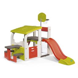 Vos enfants rêvent d'une aire de jeux dans le jardin ? Adoptez vite ce Fun center de Smoby. C'est une aire de jeux idéale pour jouer et se dépenser, les enfants vont adorer l'avoir à disposition afin d'y jouer toute la journée. L'aire de jeu Fun Center se divise en deux parties : Le coin maison comprenant un portillon, un coin repas et un toit tissu imprimé ainsi qu'un espace multi-sport composé d'un toboggan, 1 panier de basket, 1 cage de foot et un mur d'escalade !