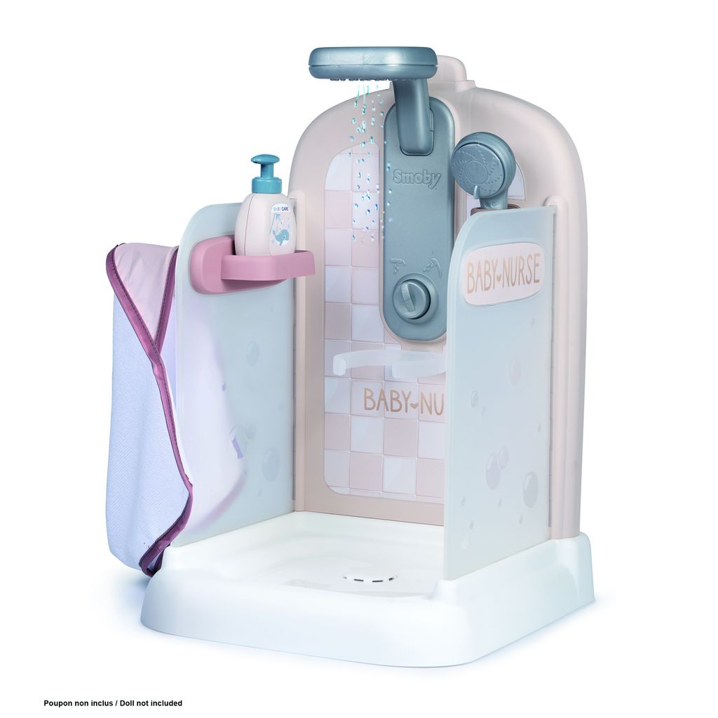 Avec la douche Baby Nurse, votre enfant pourra prendre soin de son poupon ! La douche possede un pommeau de douche fonctionnel : remplissez le réservoir d'eau et grâce a un systeme de pompe, votre petit pourra alors s'amuser a laver son poupon avec les jets d'eau ! Un porte-poupon, des pateres, une étagere, un pommeau de douche fonctionnel (circuit fermé) et divers accessoires sont inclus pour agrémenter les fonctions de jeu : cape de bain matiere éponge, pousse-mousse gel douche avec action mécanique, douchette amovible. Livret éducatif inclus. Pour poupons jusqu'a 40cms. Poupon non inclus. A partir de 3 ans.