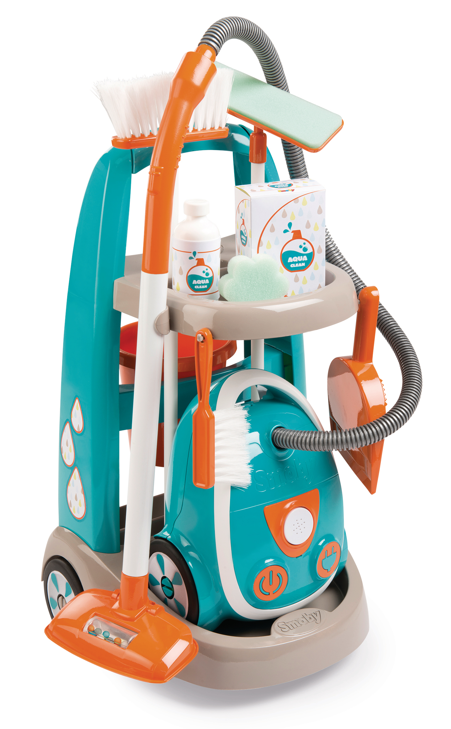 Avec ce chariot de ménage, nettoyer deviendra un jeu ! Ce kit contient tous les accessoires nécessaires pour traquer la poussière et la saleté ! Il y a un aspirateur, un balai, un ensemble pelle et balayette, un balai-serpillière, un seau, une éponge en mousse et du liquide nettoyant en bouteille et