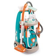 Chariot ménage avec de nombreux accessoires inclus : 1 balai, 1 balayette, 1 pelle, 1 balai serpillère, 1 bouteille, 1 boite factice, 1 éponge fleur, 1 seau + 1 aspirateur.