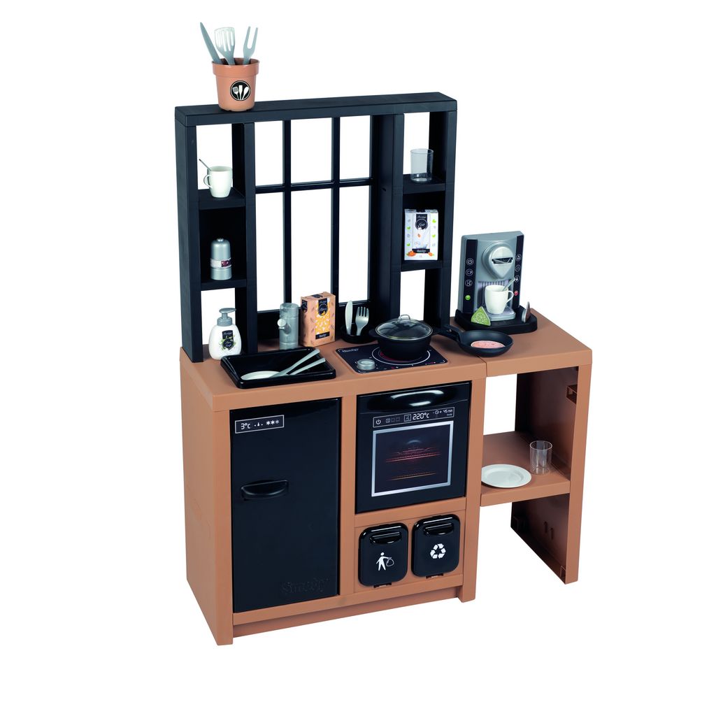 Avec son style industriel, sa verrière, ses lignes épurées et ses couleurs tendance, cette cuisine s'intègre harmonieusement dans tous les intérieurs. Ses dimensions à la fois spacieuses et compactes offrent la possibilité à plusieurs enfants de jouer ensemble sans encombrer la maison. Elle propose divers espaces qui permettent aux enfants d'imiter les adultes, notamment grâce à la plaque de cuisson, le four, le réfrigérateur, la machine à café, l'évier et les bacs de tri.