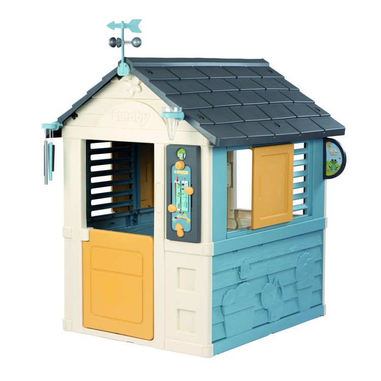La cabane enfant Smoby Maison 4 Saisons est une maison sur le theme de la météo et des saisons. Elle possede 1 portillon, 2 fenetres avec persiennes et 2 volets coulissants. Les enfants peuvent mesurer la pluie, le vent et la température grâce au pluviometre et a la girouette/anémometre. La maison est également équipée d'un carillon et d'un tableau ludique.