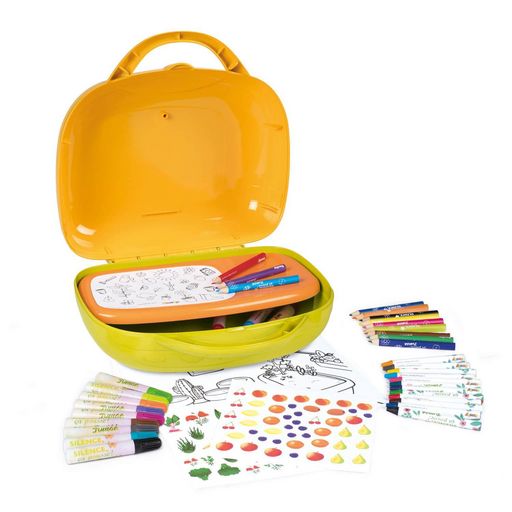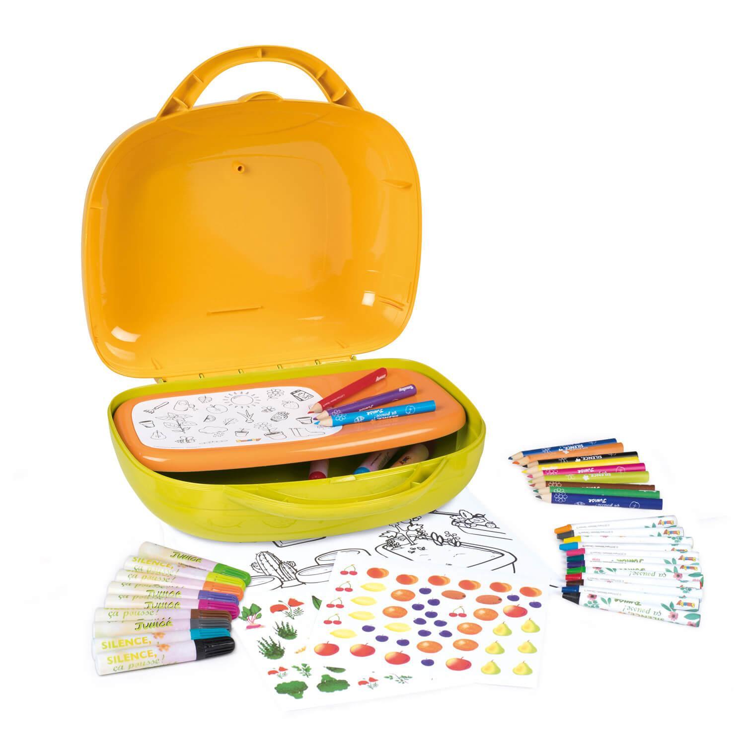 Découvrez la mallette d'activités pour faire du dessin Silence ça pousse de la marque Smoby.De nombreux accessoires de dessin sont inclus : 12 feutres, 12 crayons cire, 12 crayons de couleurs, 1 bloc de feuilles pré-dessinées de jardins, et des planches de stickers fleurs/plantes/légumes/fruits pour