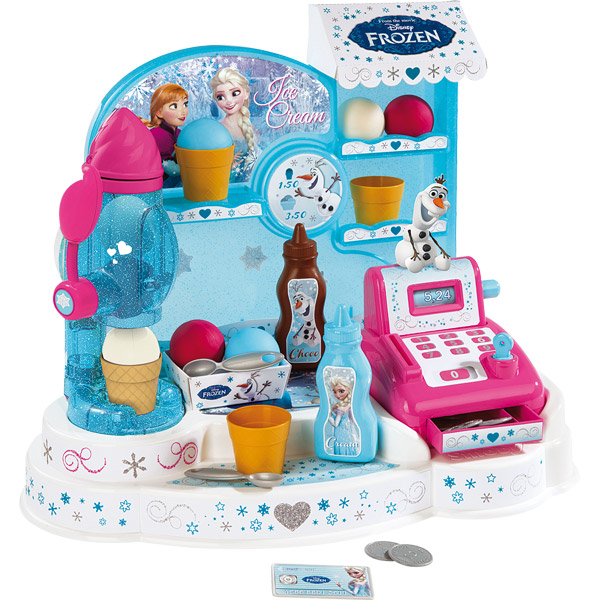 Deviens le meilleur des glaciers avec la marchande de glaces La Reine des Neiges de Smoby. Crée tes glaces en cornet ou en pot avec les boules roses, blanches et bleues, nape-les avec le colis chocolat ou la crème, expose-les dans ta boutique, enfin vends-les et passe à la caisse.