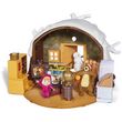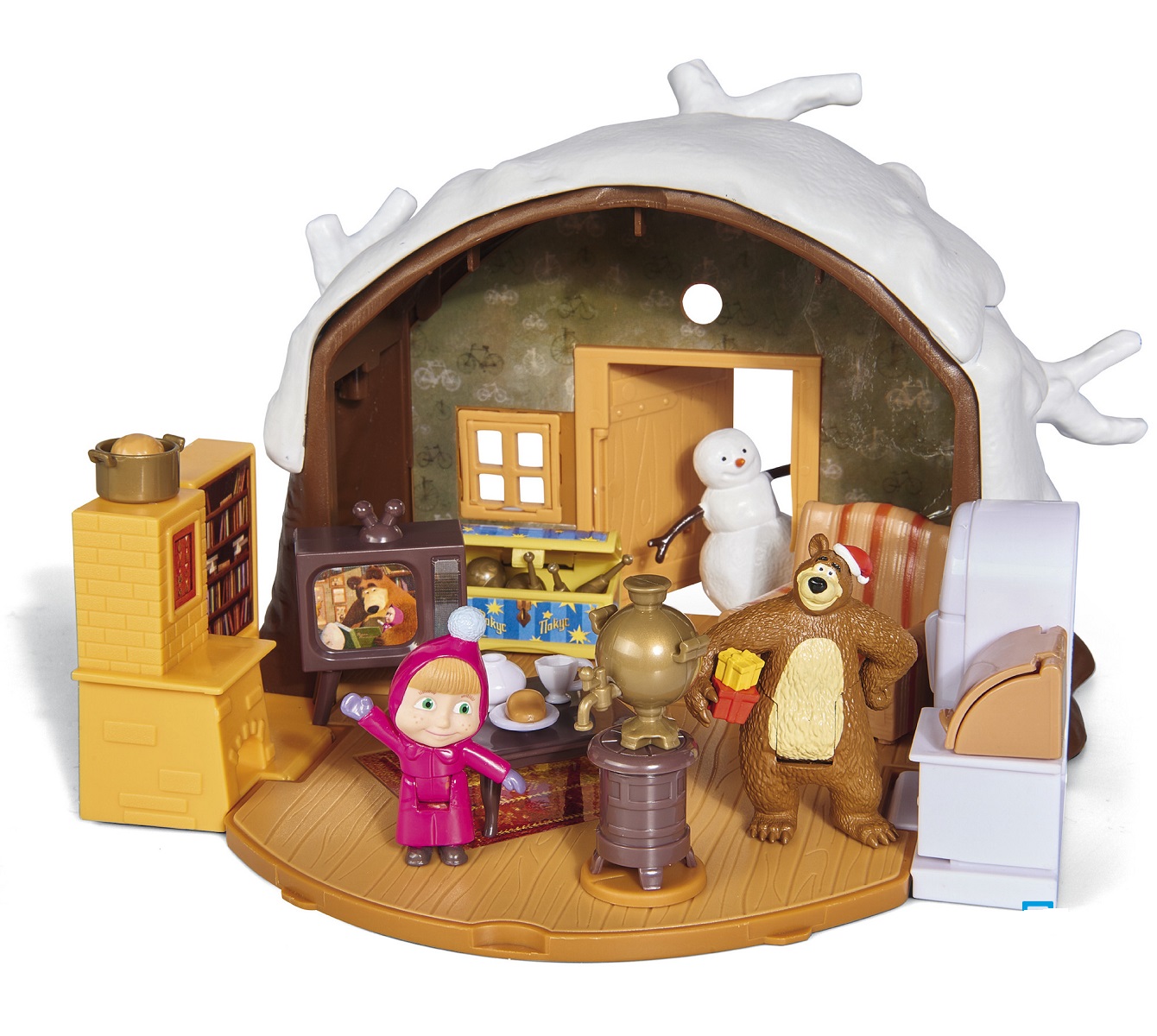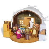 - La hutte de Michka se déplie à l'arrière pour laisser apparaître la zone de jeu et les différents accessoires de mobilier pour recréer l'ambiance de la série animée "Masha et Michka".