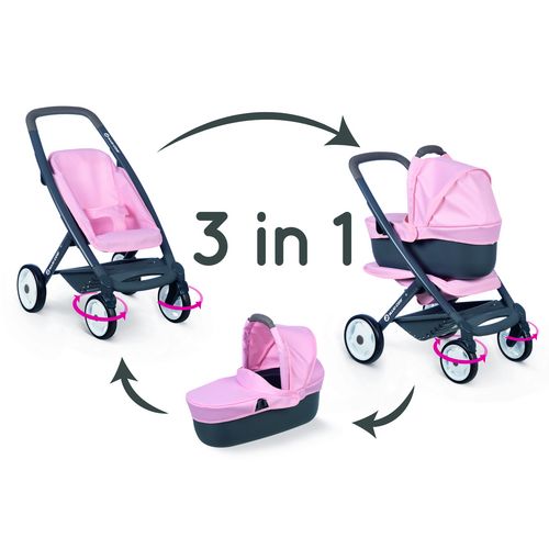 Il comprend une poussette, un landau et une nacelle, tous adaptés aux poupons d'une taille maximale de 42 cm. La poussette 3 en 1 est l'option parfaite offrant une solution polyvalente pour toutes les situations. Si la poupée préférée de l'enfant est fatiguée, la capote peut être repliée pour créer un espace confortable pour la sieste. La partie supérieure de la poussette se détache facilement en quelques étapes, permettant au petit compagnon d'être emporté n'importe où dans le panier de transport pratique. Lorsqu'un voyage d'exploration passionnant est au programme, la poussette se transforme sans effort en une poussette agile. Ainsi, la poupée peut s'installer confortablement et accompagner joyeusement l'aventure à venir. C'est l'accessoire idéal pour permettre aux enfants de s'amuser à jouer les rôles de papa et maman !
