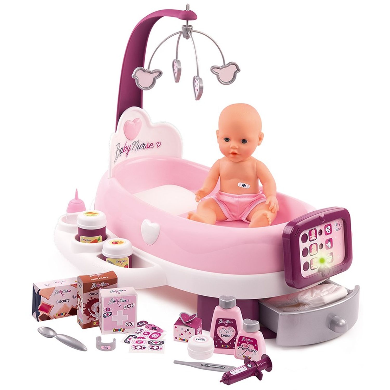 Grâce à la nursery électronique Baby Nurse de Smoby, prends soin de ton bébé et soigne-le avec les nombreux accessoires et en t’aidant de la tablette électronique amovible ! Une LED et un son se déclenchent aléatoirement, en indiquant ce qui ne va pas et ce qu’il faut faire. 3 boutons su