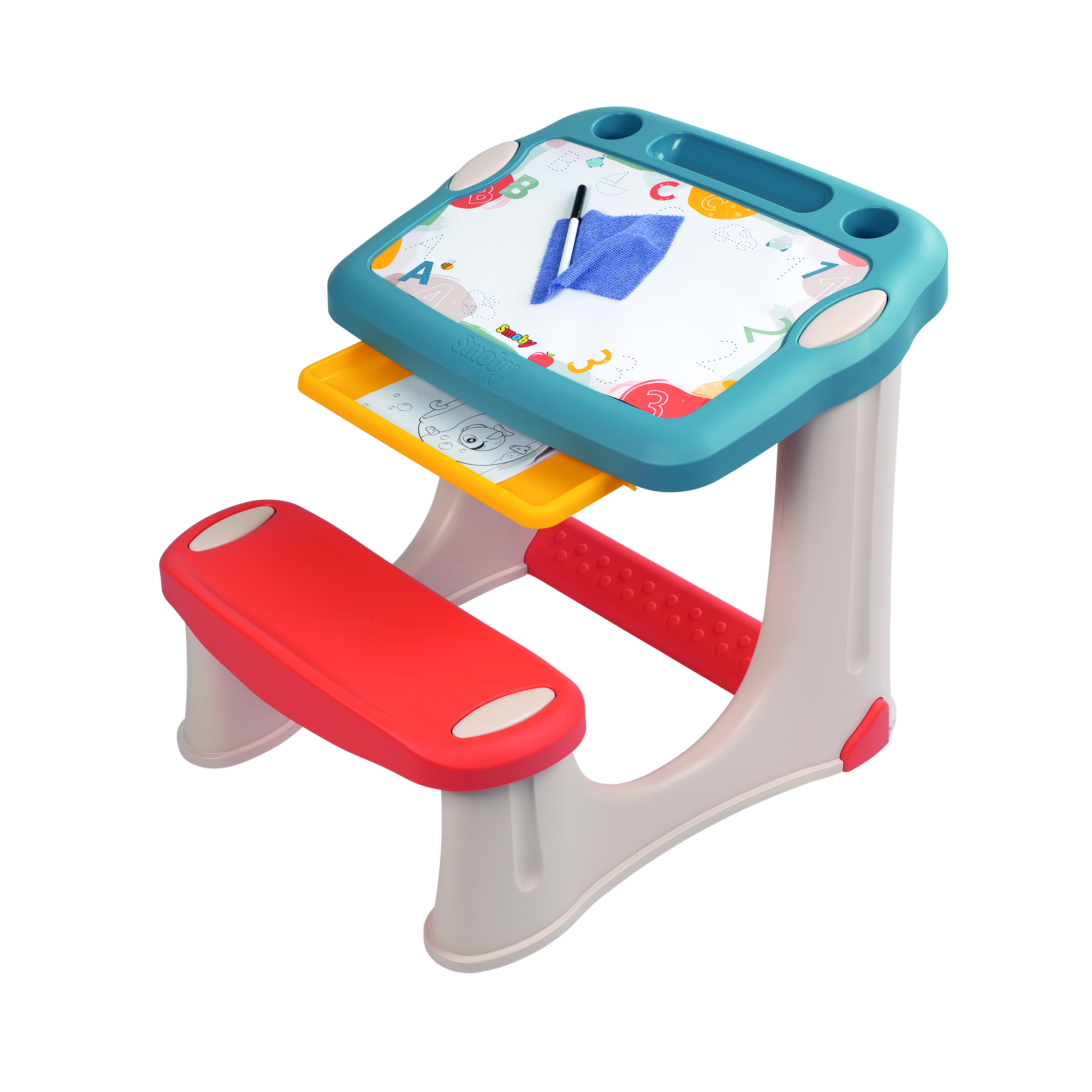 Son plateau, légèrement incliné et décoré, comporte une grande surface de dessin avec un IML pour pouvoir écrire au feutre effaçable, et 3 zones de rangement pour crayons et feutres. Il est possible d'y insérer 2 pots de peinture (non inclus).