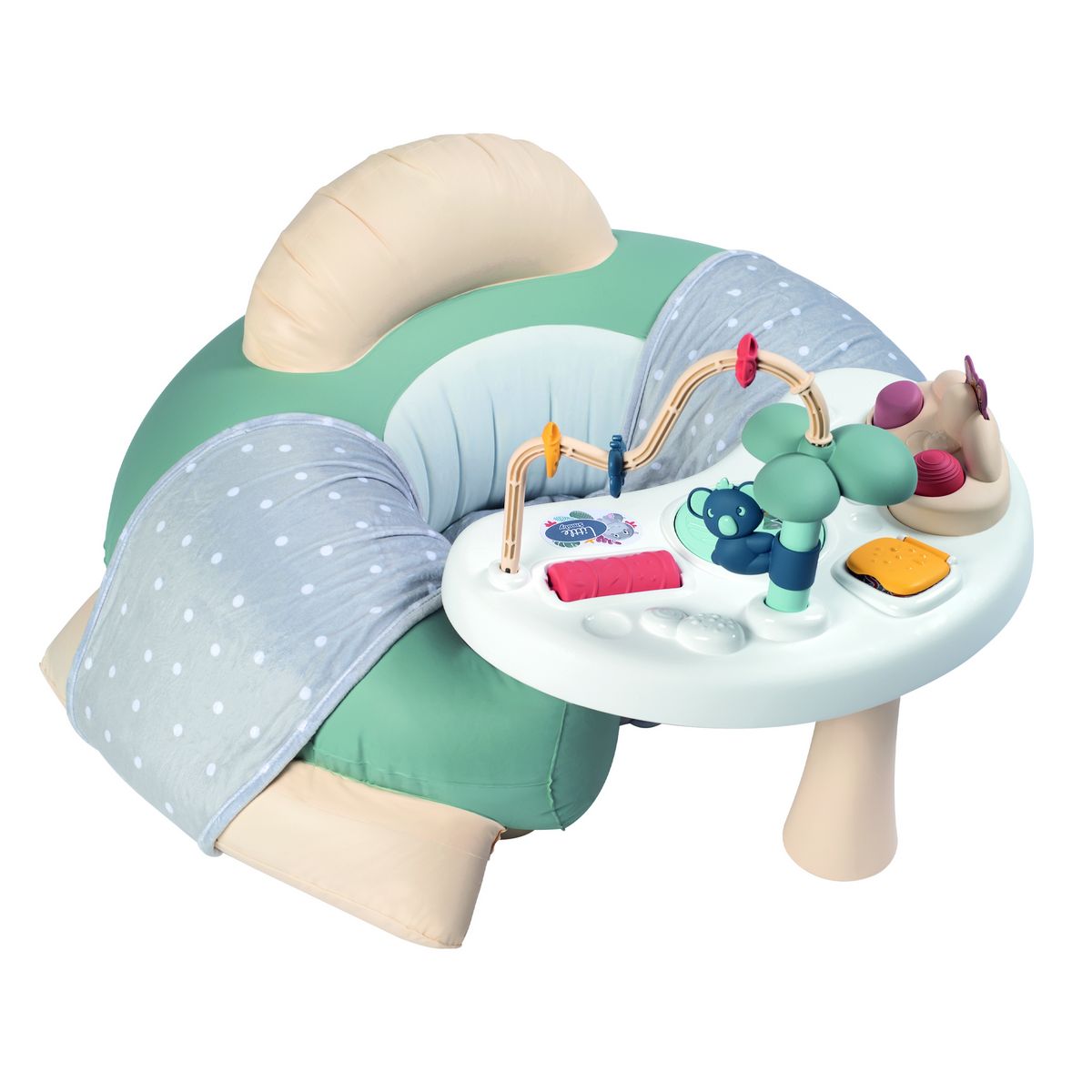 Ce siège gonflable offre un confort exceptionnel grâce à ses billes en polyester, et il est doté d'accoudoirs recouverts d'une housse en tissu. En plus d'être un siège douillet, il est également équipé d'une tablette offrant une variété d'activités d'éveil pour les tout-petits comme :