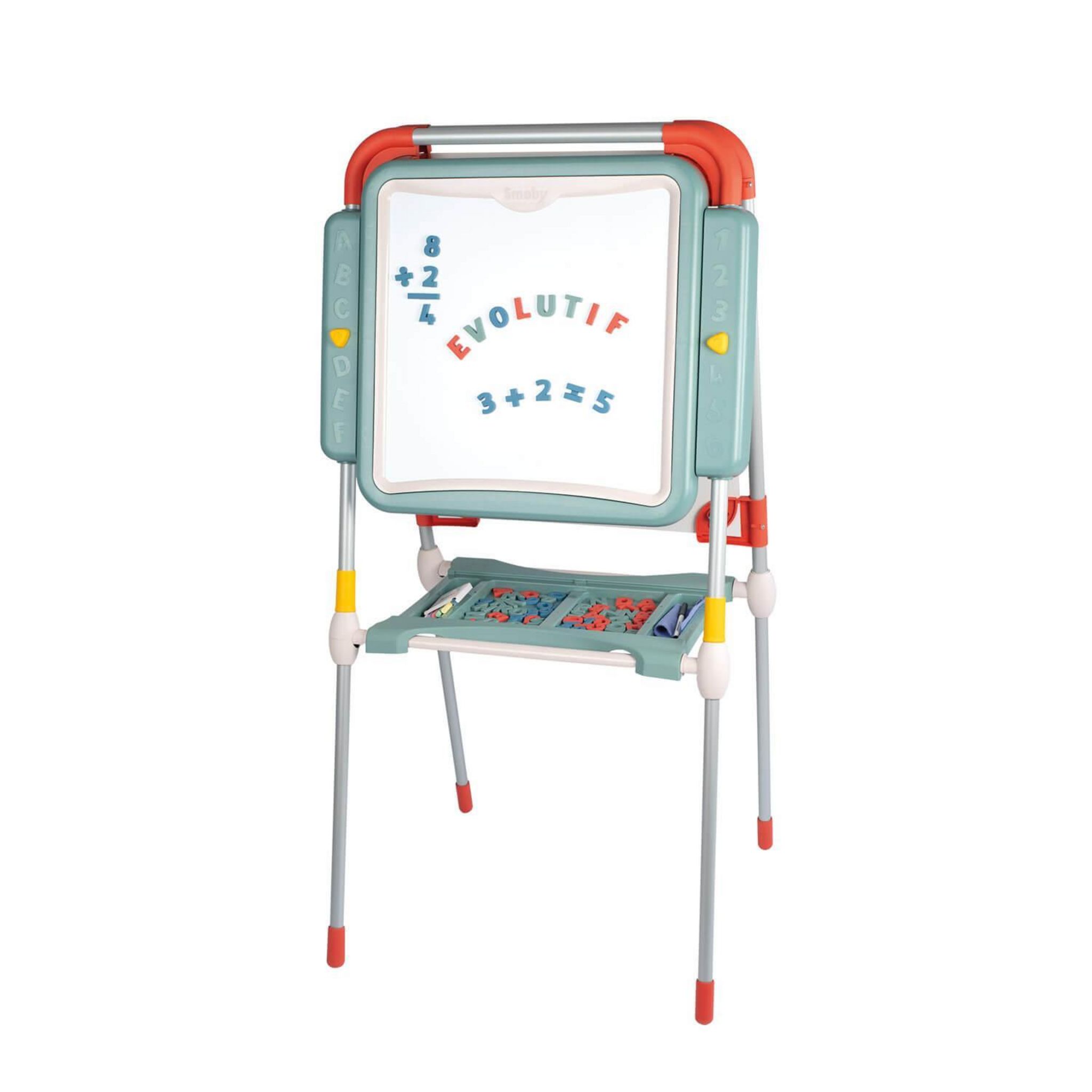 Tableau double-face de la marque Smoby. Livré avec 1 set de 72 lettres et chiffres magnétiques, 1 feutre effaçable à sec, 6 craies de couleur, et 1 chiffonnette. Dimensions : 67 x 130 cm. Age minimum : 3 ans