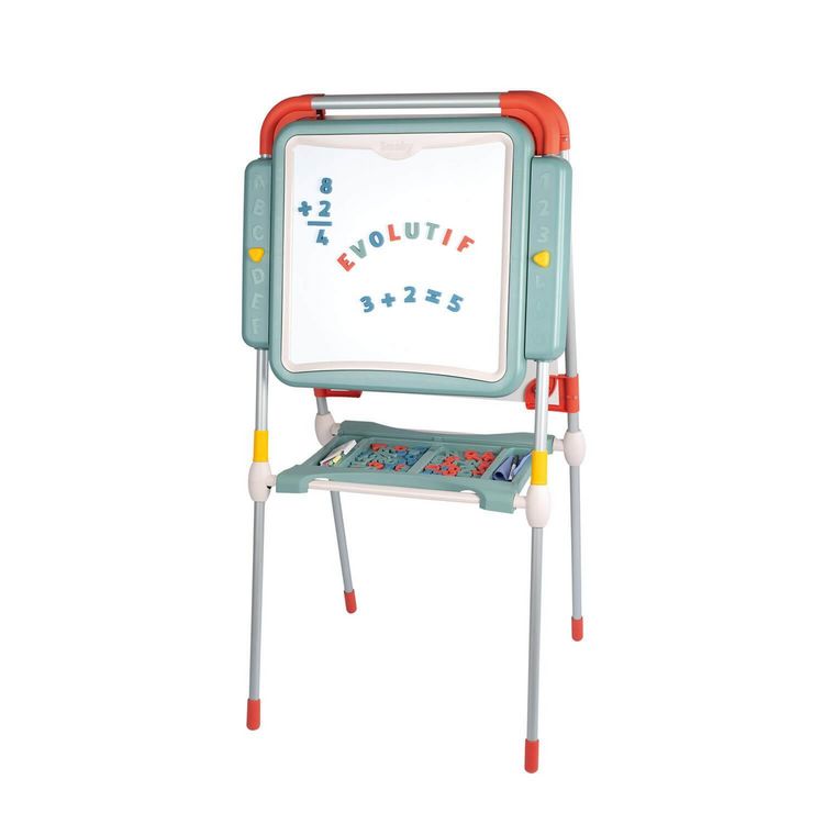 En savoir +Tableau double-face de la marque Smoby. Livré avec 1 set de 72 lettres et chiffres magnétiques, 1 feutre effaçable à sec, 6 craies de couleur, et 1 chiffonnette. Dimensions : 67 x 130 cm. Age minimum : 3 ans