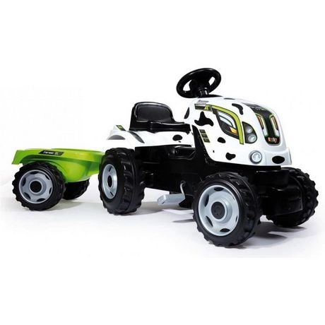 Votre enfant s'amusera a jouer avec le robuste tracteur pour enfants Farmer XL avec remorque amovible et motif de vache de la marque Smoby !