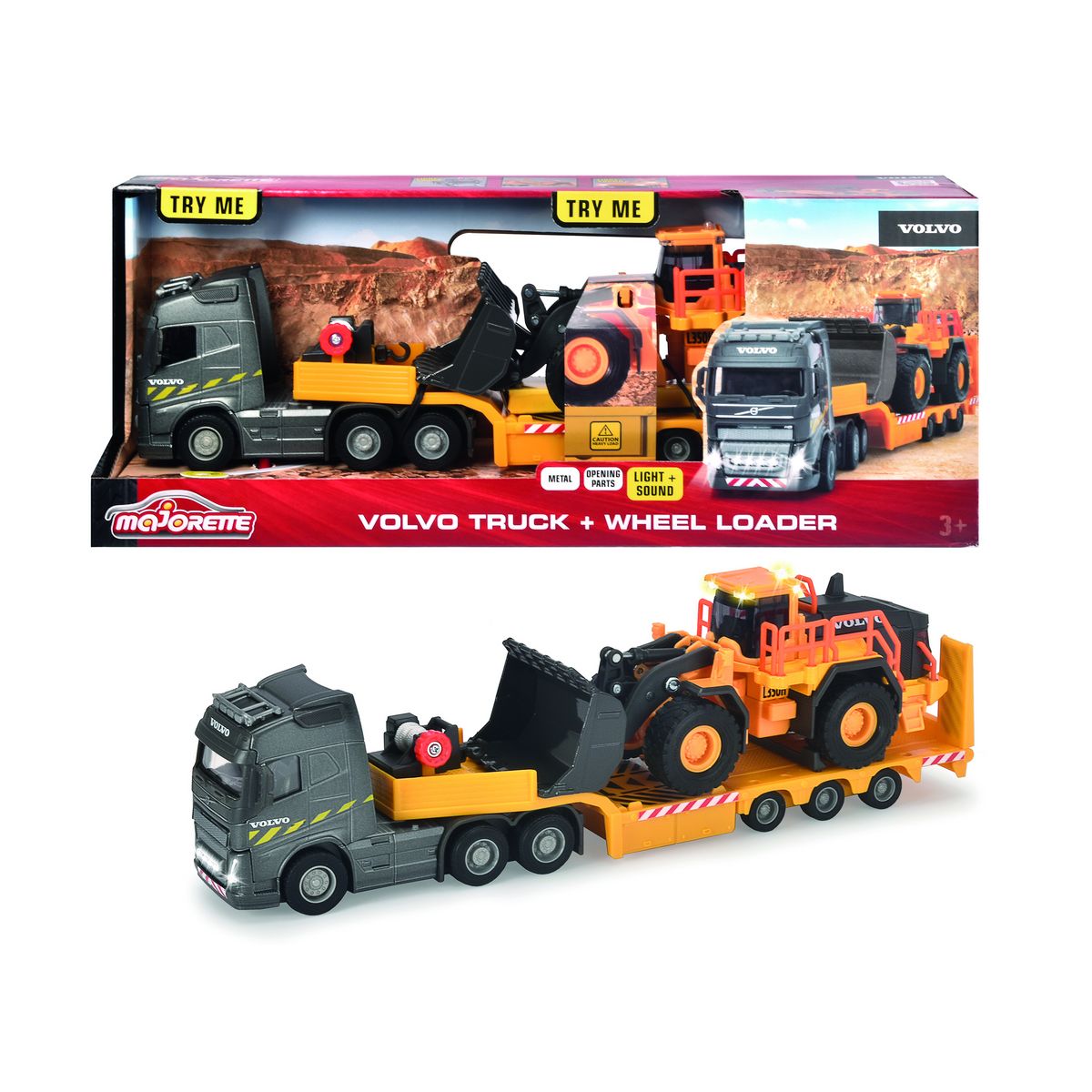 Retrouvez les automobiles les plus célèbres au format mini et en métal grâce à Majorette !Véritables passionnés ou simples amateurs vous trouverez votre bonheur parmi les nombreuses gammes que présente la marque !Sur ces véhicules de chantier, camion transporteur + chargeur L350H Volvo, à roues libres tout est mobile pour se créer un univers toujours plus réaliste !Vous serez vite séduit par ces véhicules à l'échelle 1/43ème qui disposent de parties ouvrantes ou mobiles, de phares translucides, suspensions et fonctions sons et lumière !N'hésitez plus à commencer une nouvelle collection ou à amuser vos enfants avec ces petites voitures !A partir de 3 ans.