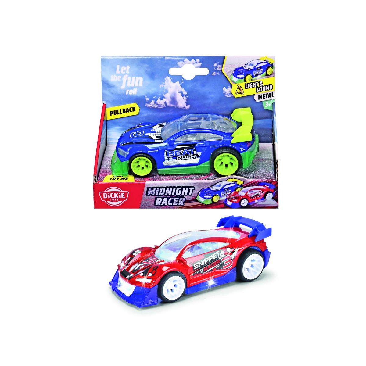 La voiture de course en métal a rétro friction avec son et lumiere Midnight Racer de Dickie Toys est un jouet de grande qualité pour les enfants de plus de 3 ans. Mesurant 12 cm de long, elle est disponible en deux assortiments de couleur rouge et bleu.