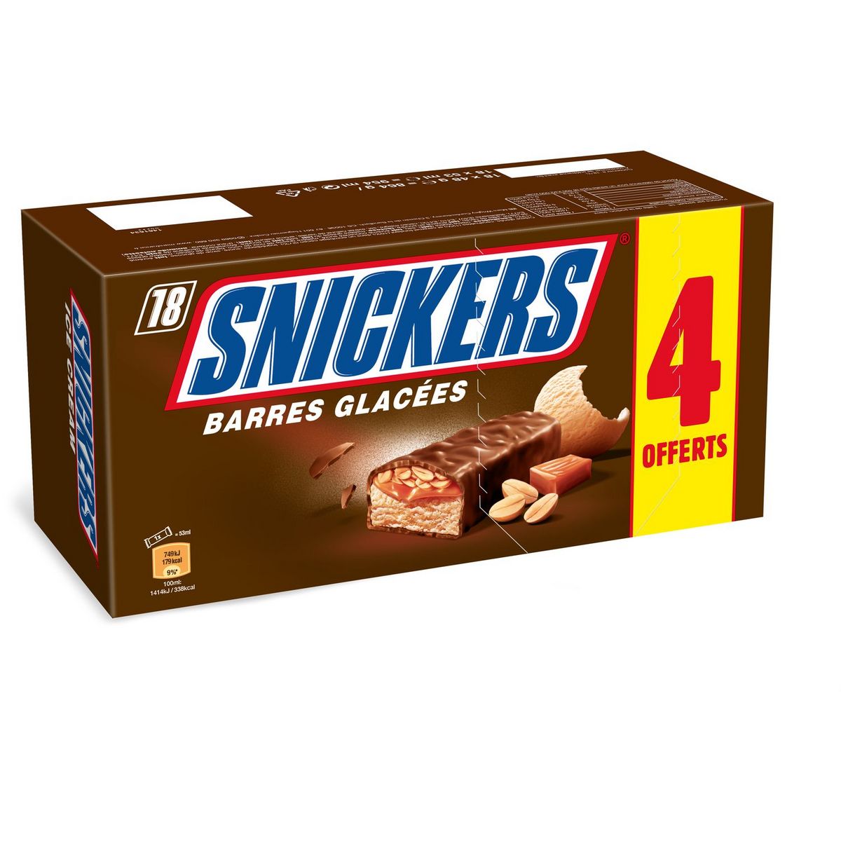 L'expérience unique Snickers® glacé : une crème glacée onctueuse à la cacahuète, recouverte d'une couche de cacahuètes croquantes et d'un caramel fondant, le tout dans un enrobage craquant Crème glacée, cacahuètes (12%) et caramel fondant (16%) dans un enrobage cacao (27%).