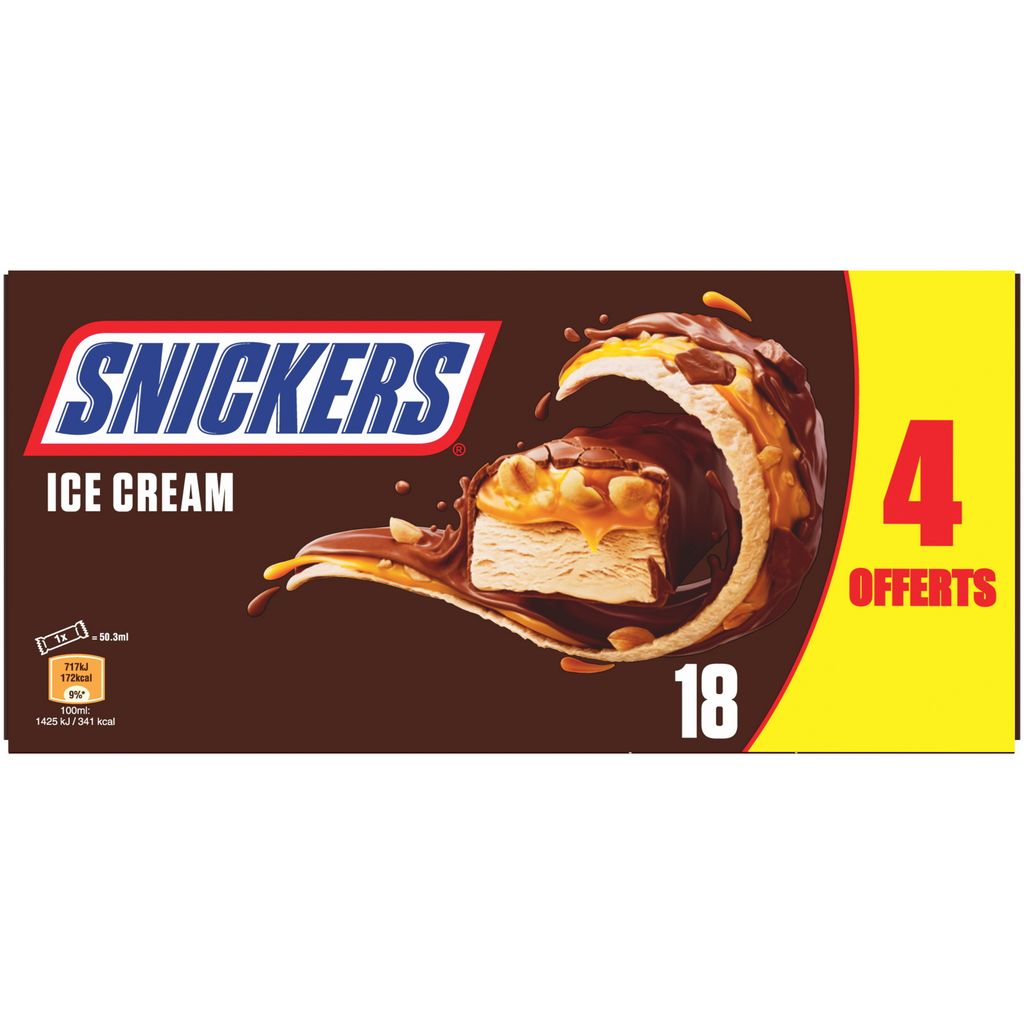 Snickers glace, cacahuètes (12%) et caramel fondant (16%) dans un enrobage cacao (27%) 18 barres dt 4 offertes 905.4ml 820.8g