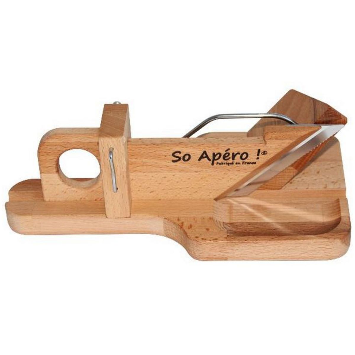 So Apero 110115 Guillotine à saucisson & charcuterie So Apéro 110115. Un véritable outil conçu pour la découpe du saucisson et des saucisses ! Toujours prête à l'emploi, cette guillotine à saucisson vous permet de couper sans effort et en tranches régulières toutes sortes de charcuterie, saucisson artisanal, saucisse sèche, chorizo, .... Elle deviendra vite la star de vos apéros entre amis ! En hêtre brut non traité et non teinté afin de respecter les produits alimentaires d'un point de vue bactériologique et gustatif. Lame en inox de coutellerie trempée et crantée.