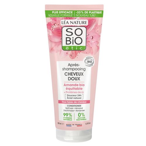 L'après- shampooing Cheveux Doux SO BiO étic, adapté à tous les types de cheveux, combine l'action du lait d'Amande bio équitable et des protéines de riz pour une chevelure plus brillante et facile à démêler. Formulé sans silicone et sans huile minérale afin de respecter vos cheveux. Résultat : Votre chevelure retrouvent douceur pour 24h et son éclat naturel ! -Démêlage facile : 80% -Cheveux brillants : 77% % de satisfaction, obtenu après 5 utilisations. Panel réalisé sur 66 femmes. COSMOS ORGANIC certifié par ECOCERT Greenlife 99% d'origine naturelle 0% silicone, huile minérale +ETHIQUE : - Filière bio éthique - Tube végétal (hors capsule) : 33% de plastique en moins vs le tube 200 ml précédent. - Fabriqué en France - 1% for the planet