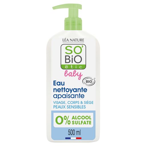 Des soins certifiés BIO adaptés aux peaux sensibles, fines et fragiles des nourrissons, garantissant sécurité et tolérance dès la naissance. L'Eau nettoyante apaisante SO'BiO étic® baby nettoie et rafraîchit la peau de bébé en douceur sans nécessité de rinçage. Dès l'application, sa peau est propre et souple. L'Eau nettoyante apaisante SO'BiO étic® baby nettoie et rafraîchit la peau de bébé en douceur sans nécessité de rinçage. Dès l'application, sa peau est propre et souple. COSMOS ORGANIC certifié par ECOCERT Greenlife selon le référentiel COSMOS disponible sur http://cosmos.ecocert.com 99% du total est d'origine naturelle. 20% du total des ingrédients sont issus de l'agriculture biologique. Haute Tolérance et testé sous controle médical 99% d'origine naturelle 0% alcool, sulfate, colorant & parfum de synthèse Made in France Flacon en PE végétal Recommandé à 95% par un panel de 65 parents, testé pendant 7 jours.