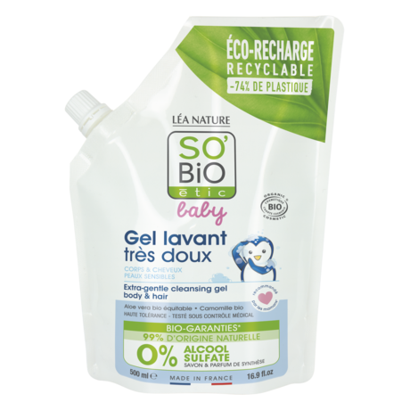 Gel Lavant très doux bio, Corps & Cheveux, Haute tolérance, Eco-recharge 500ml, SO'BiO étic baby